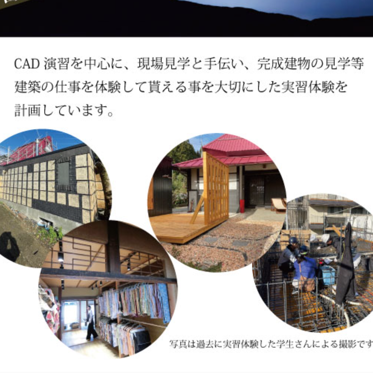 社内でのCAD演習を中心に、実際の建築現場の体験や完成建物の見学をして貰えるように計画しています。CADはJWCADを使用しますが使用したことがなくても大丈夫です。やってみたい事など希望があれば、出来る限り対応しますのでご相談下さい。