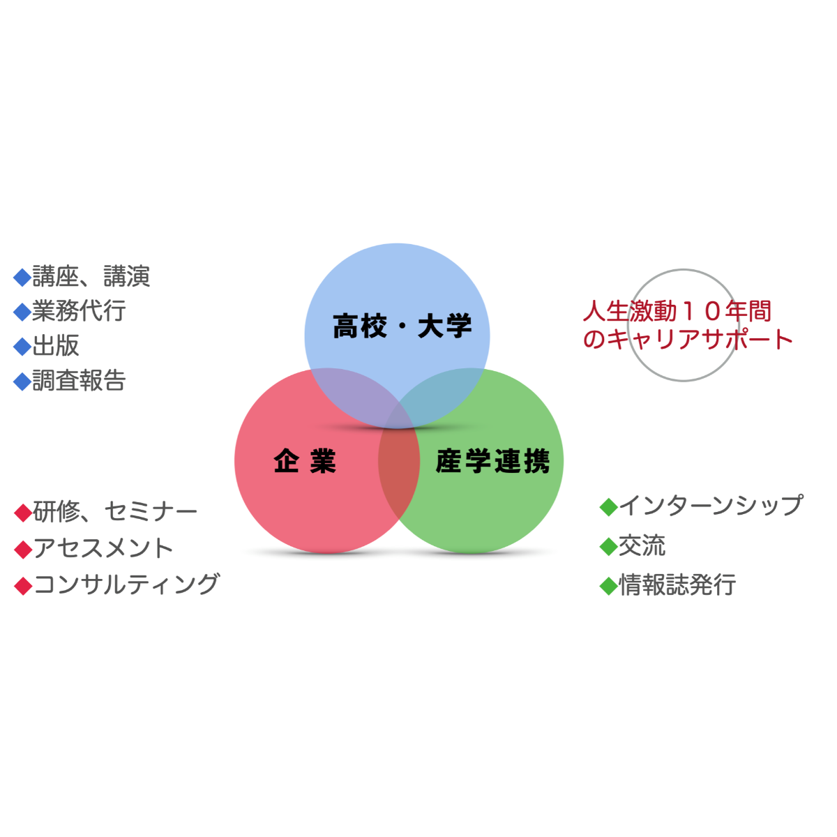| 高校・大学・社会人(3年間)の人生激動10年間におけるキャリア育成で社会貢献しています。具体的には、高校・大学でのキャリア講座や講演、企業の社員に向けた社員研修、さらに、キャリア育成に関する情報発信(blogやYouTube)、企業や大学の各種課題に対応するコンサル事業を主な事業にしています。 |