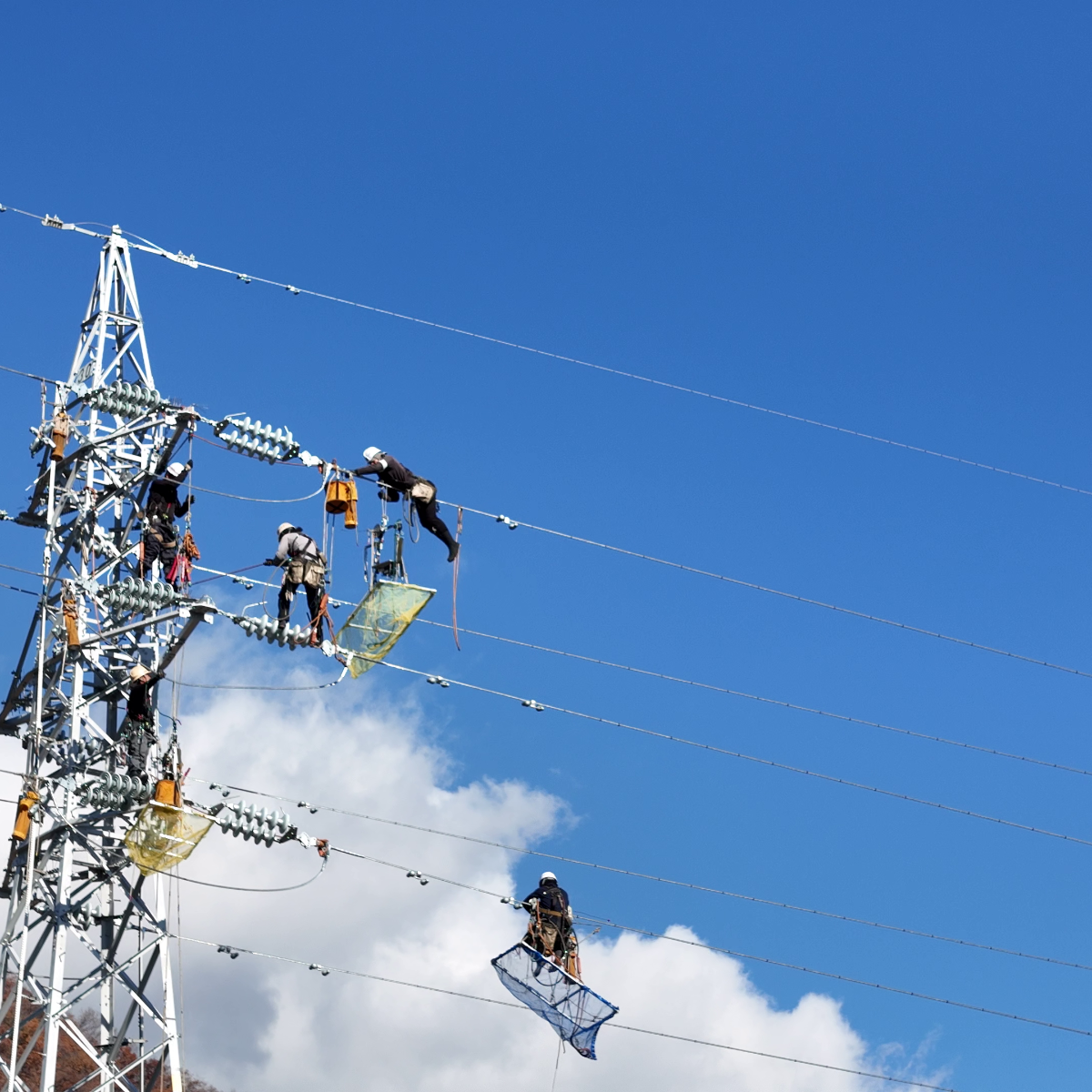 業務内容は特別高圧架空送電線の新設、改修に伴う電線架線作業が主でありますが、既設の送電線の点検や保守作業にも従事している企業です。